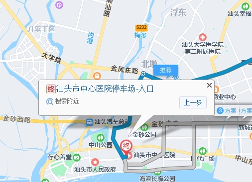 1、 從汕頭站北門乘坐公交車K2路(K2老港快線),在汕頭大學(xué)北門下車,步行前往銜接路口,然后乘坐公交車K3路(K3金平快線),在中山路步行街下車,步行約260米,即可到達(dá)汕頭市中心醫(yī)院。