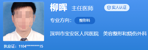 醫(yī)生介紹:柳暉醫(yī)生,整形科主任醫(yī)師,大學畢業(yè)后曾經(jīng)到國外做過進修,研讀了醫(yī)學碩土學位,現(xiàn)在是這家醫(yī)院整形學科帶頭人,擅長做各類燒傷救治項目,也擅長做眼鼻整形和面部年輕化項目,是整形界難得的多學科技術(shù)人才,擁有很先進的宙美觀,也擁有超強的耐心和很精淇的整形技術(shù)。