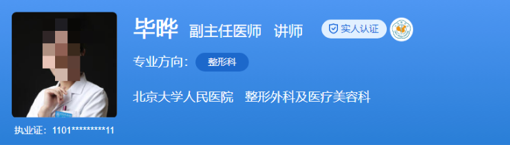 醫(yī)生介紹:畢曄醫(yī)生是北京大學(xué)人民醫(yī)院的副主任醫(yī)師、美容外科主診醫(yī)師,獲得整形外科博士學(xué)位、腫瘤外科碩士學(xué)位。她擁有整形美容和腫瘤外科雙資質(zhì),擅長(zhǎng)乳房整形、乳房再造、婦科整形等。她現(xiàn)任中國(guó)女醫(yī)師協(xié)會(huì)整形美容專業(yè)委員會(huì)青年副主任委員、中國(guó)整形美容協(xié)會(huì)女性生殖整復(fù)分會(huì)理事等多個(gè)重要學(xué)術(shù)職務(wù),在SCI及中文核心期刊發(fā)表三十多篇論文,主持課題七項(xiàng),長(zhǎng)期從事整形美容專業(yè)醫(yī)療、教學(xué)及科研工作。